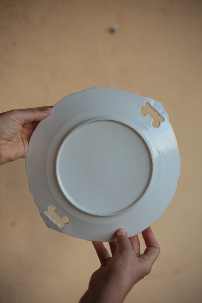 Dekorativer Teller mit Heckenrosen bemalt und Griffen
