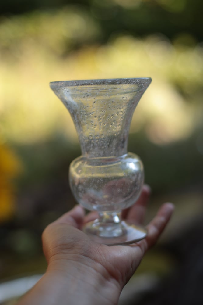 Kleine Vase, mit Fuss, weisses Glas mit Einschlüssen, mundgeblasen