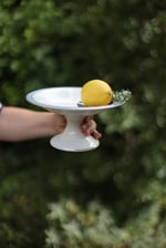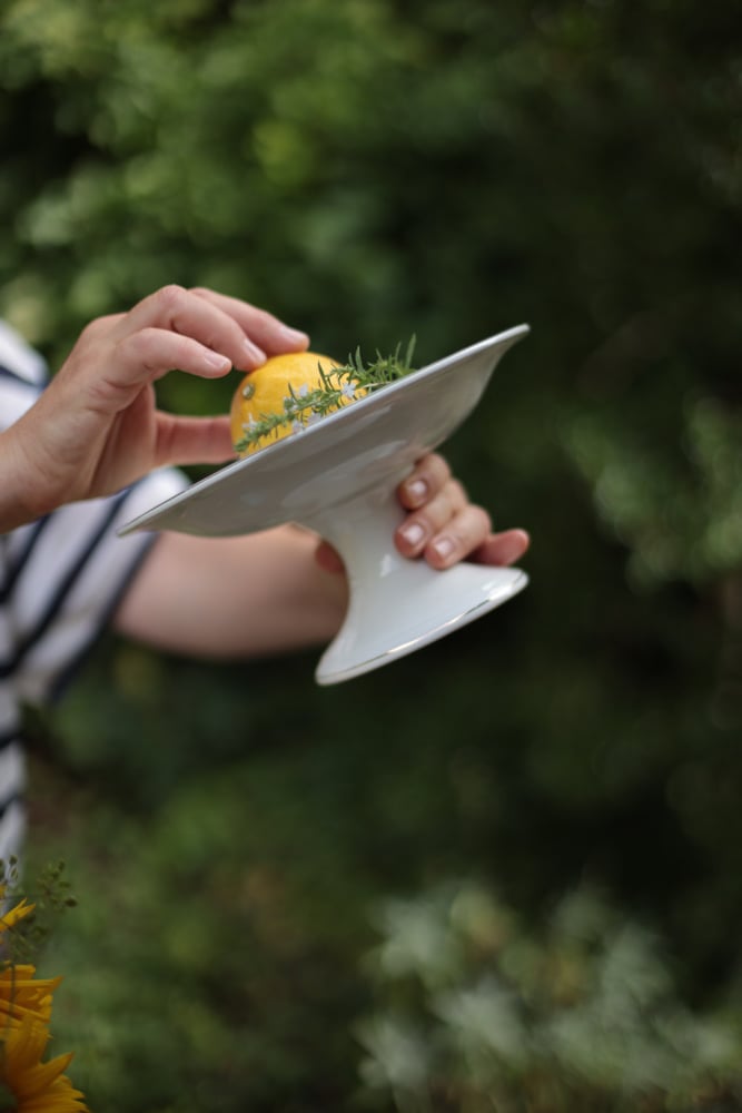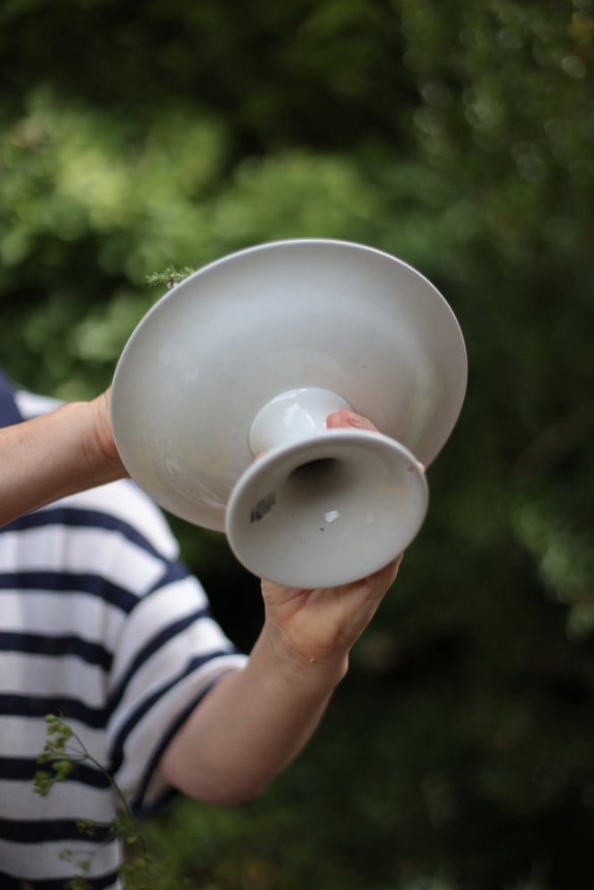 Schale fuer Obst, mit Fuss und feinem, hellblau und goldenem Rand, Porzellan